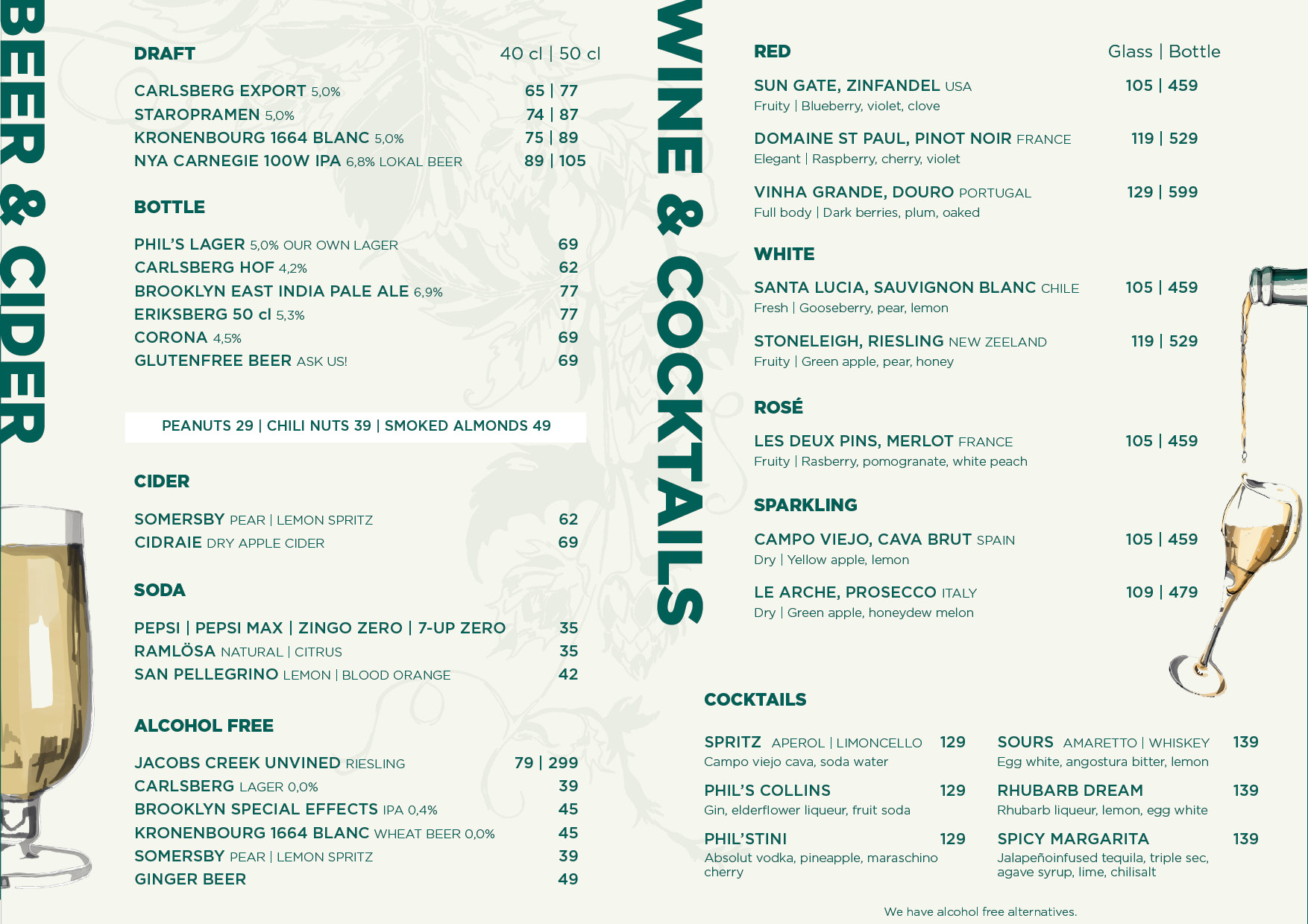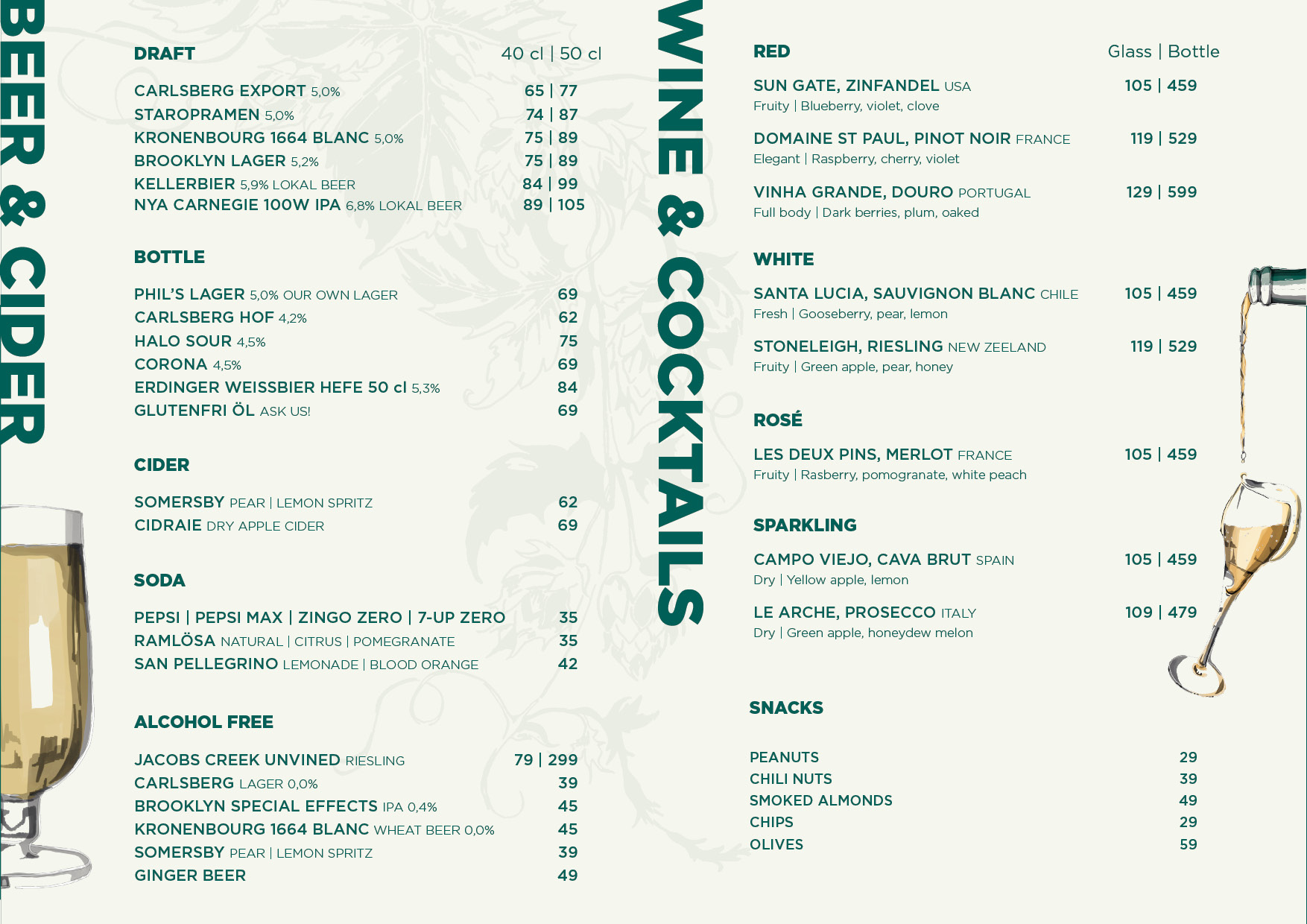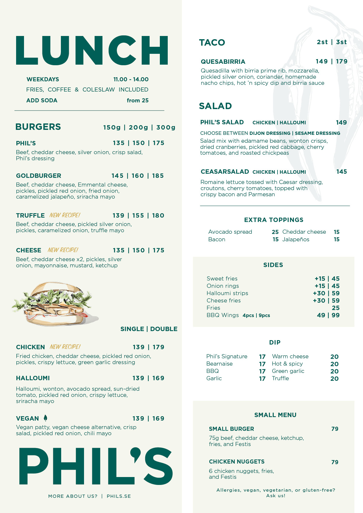 Burgers include fries/green salad, coffe & coleslaw for lunch, starting at 129 SEK. Add a soft drink for 25 SEK!
