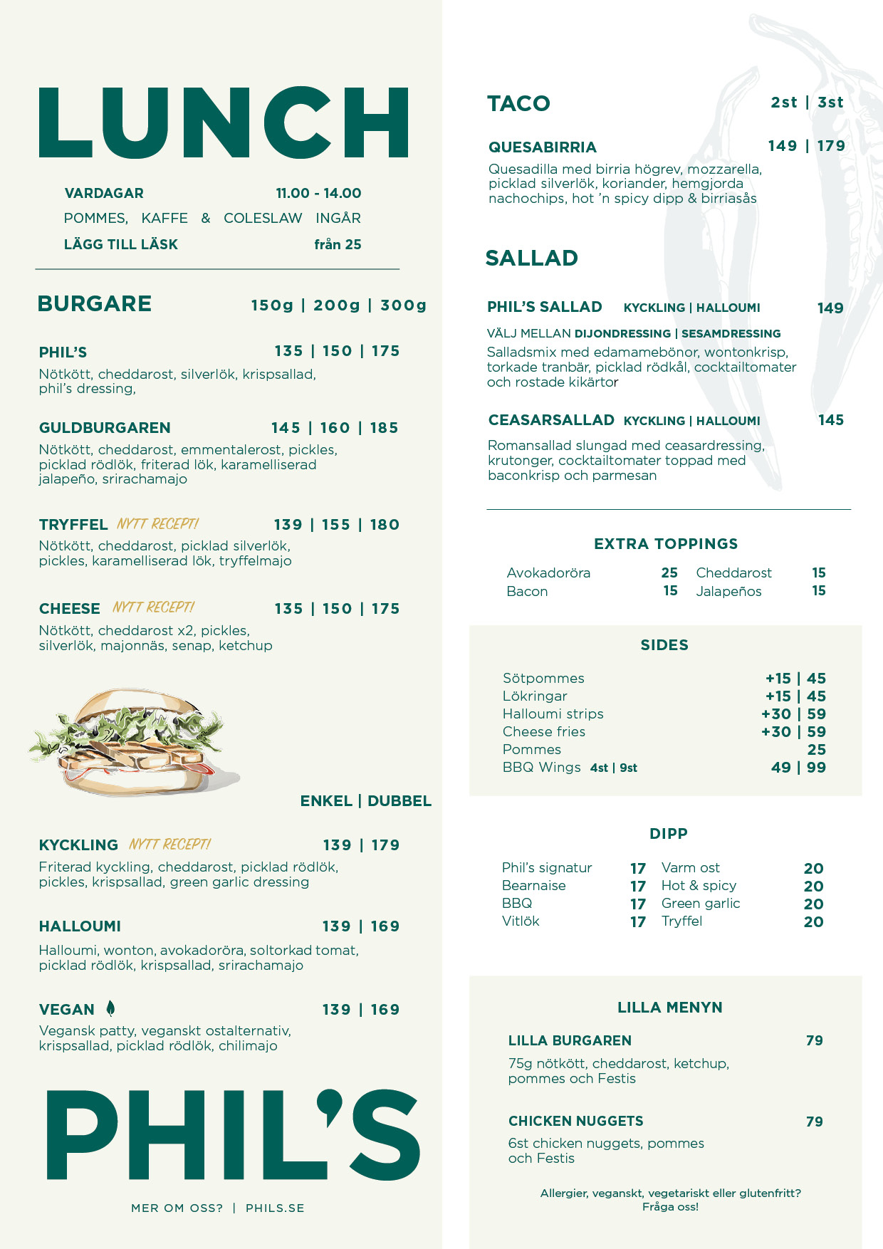 mån | PHIL’S tis | GULDBURGARE ons | CHEESE tors | TRYFFEL fre | PHIL’S