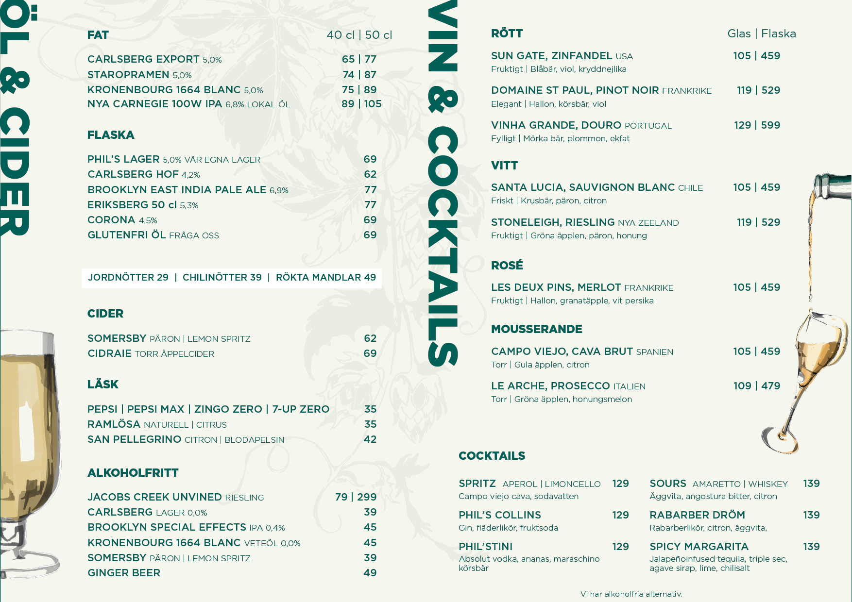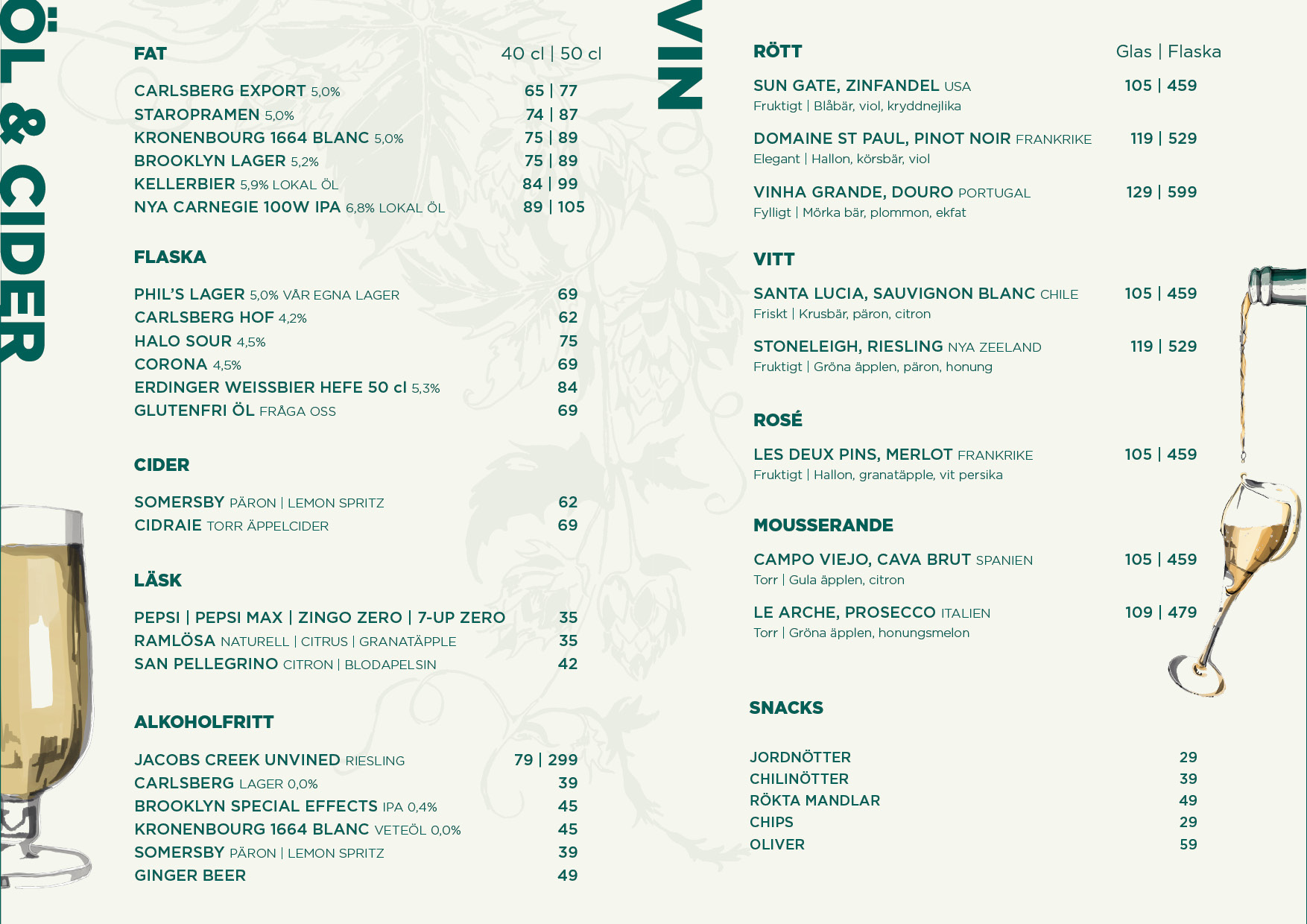 Vi har ett stort utbud på vin, öl, drinkar och icke-alkoholhaltiga drycker på menyn. Se länkar längst ner för lokala dryckesmenyer per restaurang då vi har varierande utbud på varje restaurang.